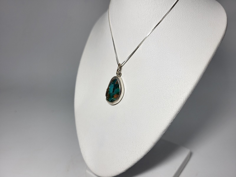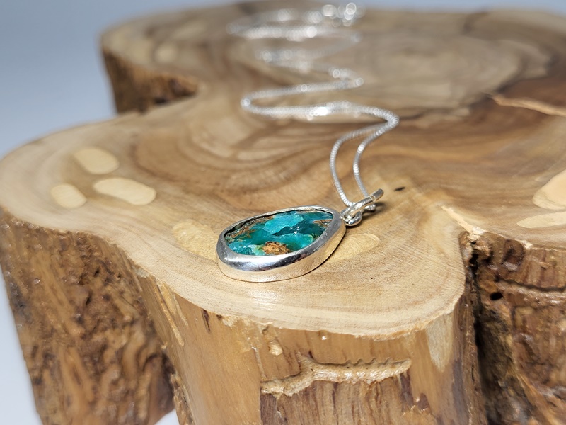 Το μενταγιόν είναι χειροποίητα δεμένο με ασήμι και ο cuprian Αδαμίτης είναι εξίσου χειροποίητος σε κοπή fancy απ’ το εργαστήριο μας. Οι διαστάσεις του μενταγιόν είναι 2*1.2