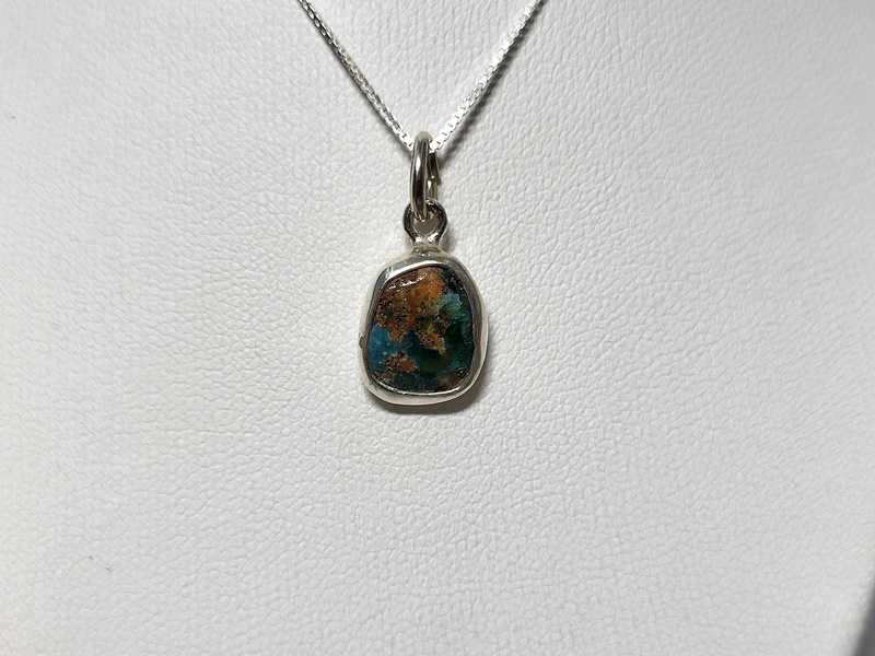 Το μενταγιόν είναι χειροποίητα δεμένο με ασήμι και ο cuprian Αδαμίτης είναι εξίσου χειροποίητος σε κοπή fancy απ’ το εργαστήριο μας. Οι διαστάσεις του μενταγιόν είναι 1.9*0.9
