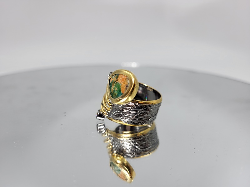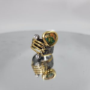 Το δαχτυλίδι είναι δεμένο με ασήμι 925 και επιχρυσωμένο σε συνδυασμό λευκού και με κίτρινου χρυσού. Ένα εξαιρετικό κόσμημα από την ξεχωριστή και χειροποίητη unique collection!