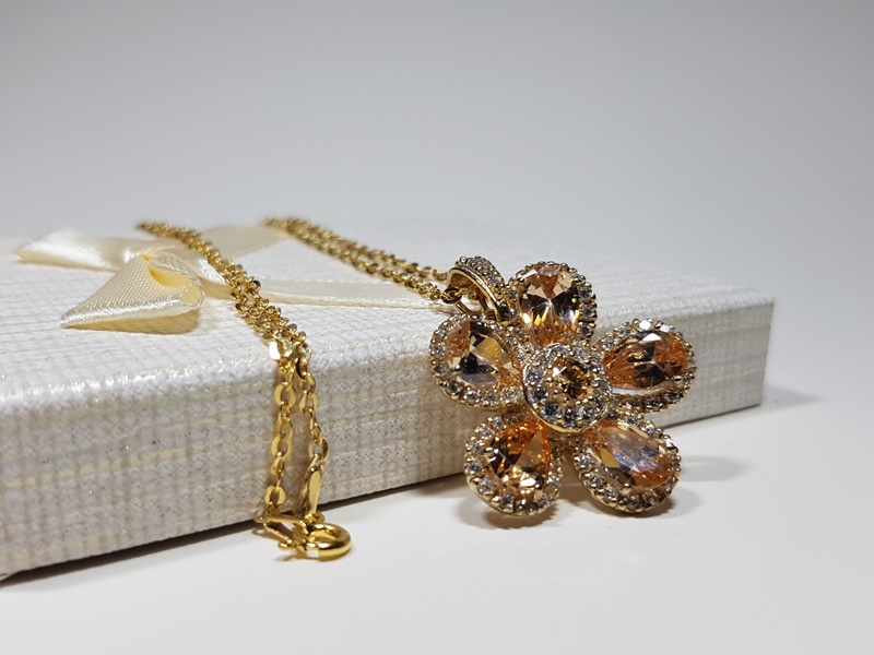 Ένα πανέμορφο κολιέ με τοπάζια σε σχήμα δάκρυου. Το μοτίφ του κολιέ είναι σε σχήμα μαργαρίτας και διακοσμείται με τοπάζια χρυσο/μπεζ χρώματος και λευκά ζιρκόν, οι διαστάσεις του μοτίφ είναι 3×3εκ. και διατίθεται με αλυσίδα ασημένια 925 διπλά επιχρυσωμένη στα 45εκ. Πραγματικά μοναδικό και εξαιρετικής ποιότητας και λάμψης κομμάτι. Απλά το φοράς και μαγνητίζεις τα βλέμματα από τη λάμψη και την πολυτέλεια! Χαρίστε ένα πραγματικά ξεχωριστό δώρο σε εσάς ή στους ανθρώπους σας και εντυπωσιάστε τους!