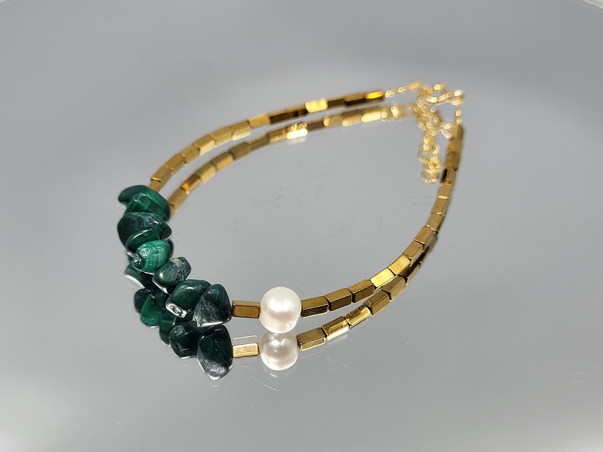 Χειροποίητο βραχιόλι με ακατέργαστο Μαλαχίτη, αιματίτη επίχρυσο σε ορθογώνιο σχήμα και φυσικό μαργαριτάρι 6mm.