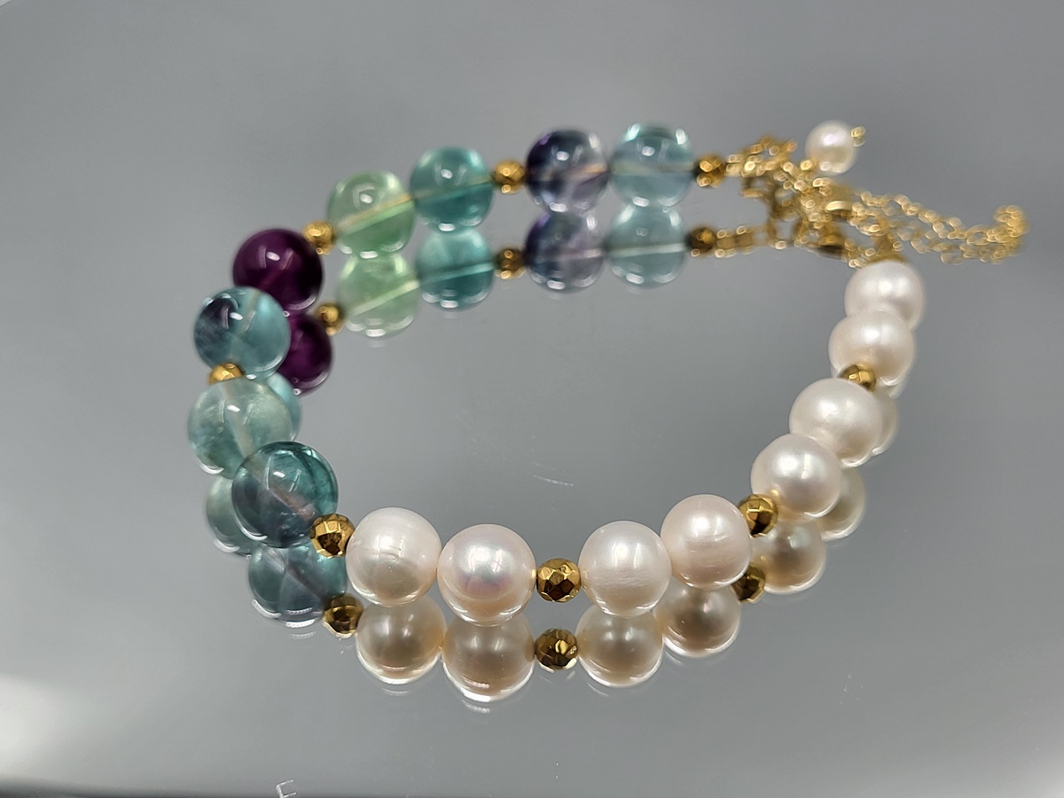 Χειροποίητο βραχιόλι με Φθορίτη 10mm και Φυσικά μαργαριτάρια 9-10mm.